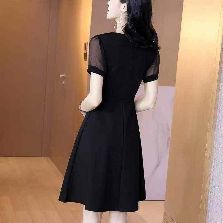 ️全清7.8 夏季女装新款赫本风雪纺拼接黑色连衣裙,修身显瘦方领A字小黑...