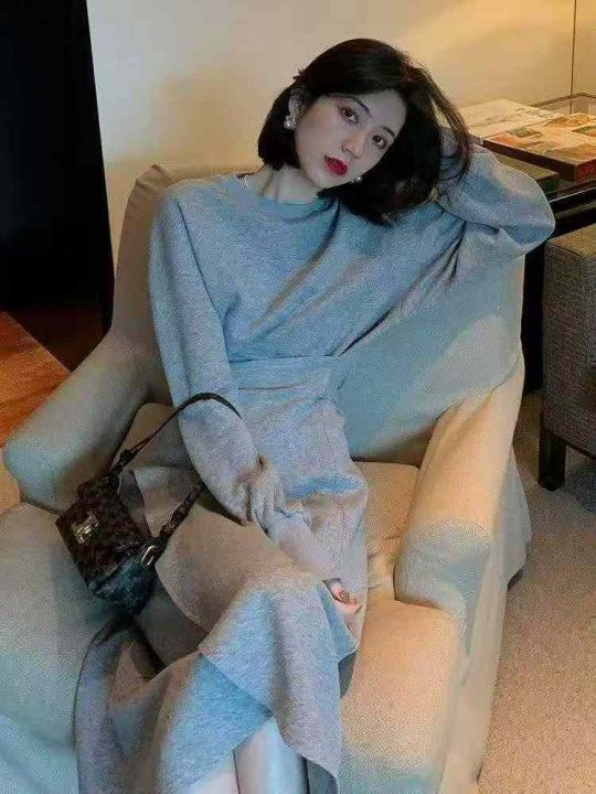 棉质裙女春秋中长款显瘦裙子韩版气质收腰长袖绑带连衣裙,面料厚实有重量,...