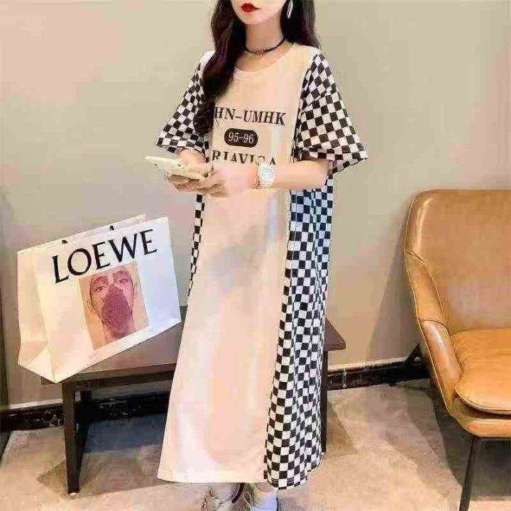 ☕️纯棉大码拼接格子长款过膝短袖T恤夏季韩版慵懒风宽松连衣裙450件全清7....