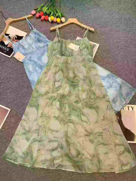 淘宝在售爆款水墨碎花丝绒宽松显瘦压褶吊带裙子,中长款法式复古连衣裙女20...