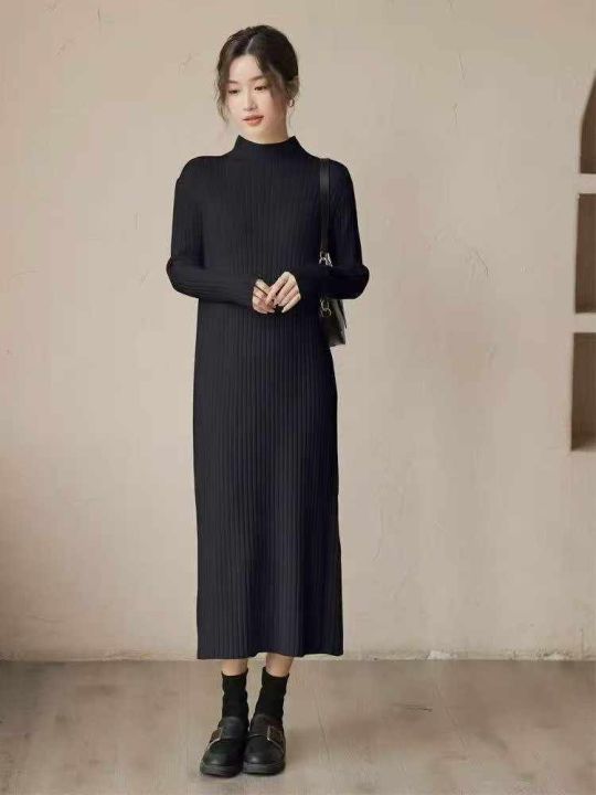 半高领内搭针织连衣裙女秋冬修身温柔气质开叉毛衣温柔风包臀裙子,独立包装...