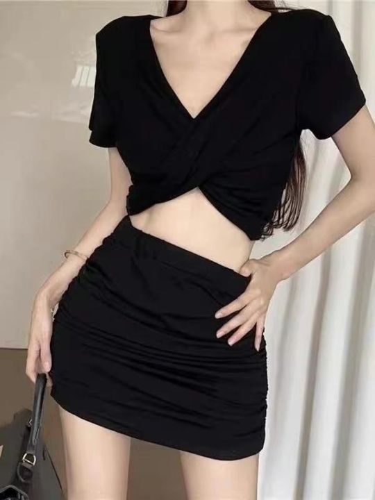 6.8清性感纯欲辣V领百搭显瘦短袖上衣褶皱半身裙套装,整款多色,数量290套...