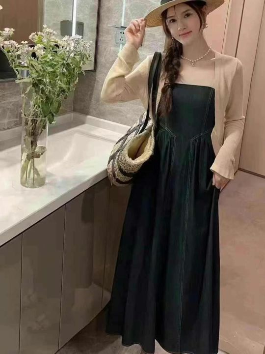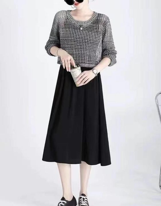 吊带两件套连衣裙160件10.8,面料有弹力,下摆开叉,镂空针织罩衫,码数S-2...