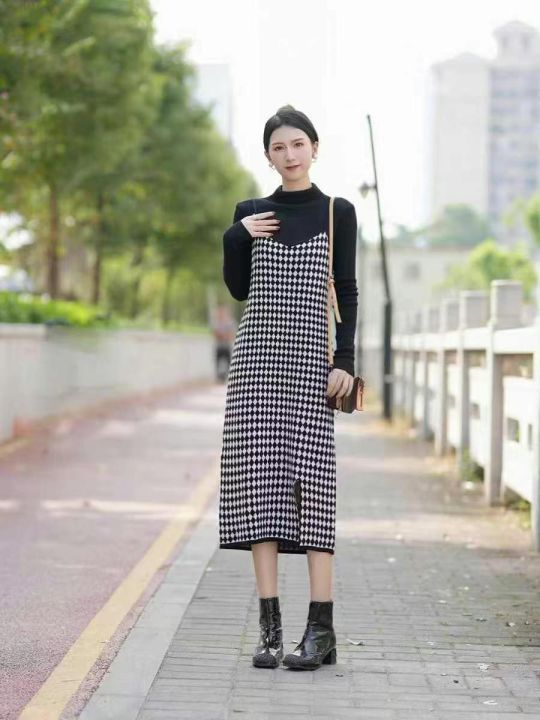 春秋新款高级感菱格纹开叉吊带针织包芯纱连衣裙,独立包装,均码面料软糯弹...
