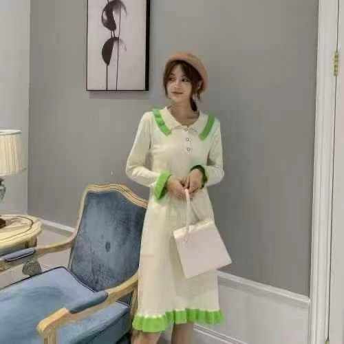 秋冬新款翻领韩版宽松学院风中长款小清新鱼尾针织包芯纱毛衣连衣裙,独立包...