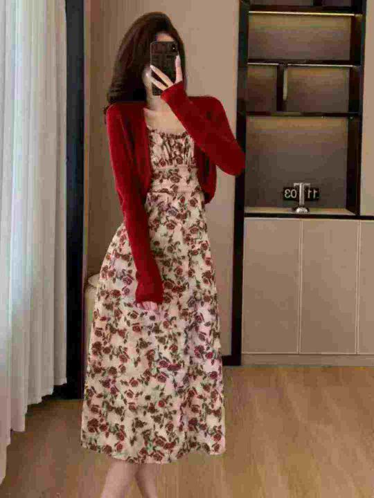 秋季新款气质中长款百搭吊带裙小碎花打底连衣裙,单款单色,单独裙子,模特...