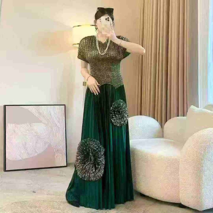 75套左右三宅轻奢重工烫金大盘花长半裙褶皱两件套收腰短袖蝙蝠衫两件套!均...
