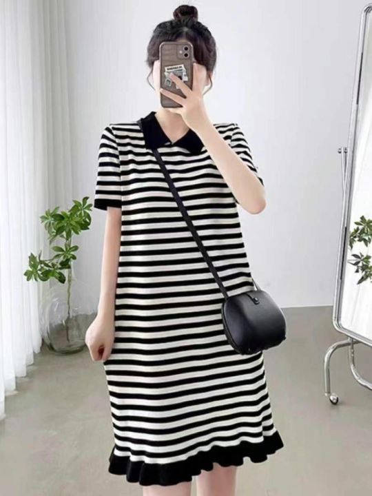 夏季新款欧洲站宽松显瘦中长款胖MM休闲大码条纹针织连衣裙,独立包装,均码...