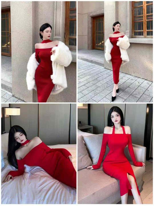 秋冬新款配大衣穿修身显瘦性感一字领挂脖前后两穿针织连衣长裙,独立包装,...