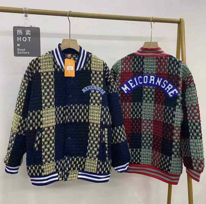 拼色编织格子棒球服204件,全清19.8,分货20.8,小香风宽松版情侣款,衣领...