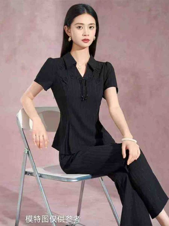 6.8清电商仓回收519套气质国风改良新中式条纹翻领短袖长裤套装,码数2-4-6...