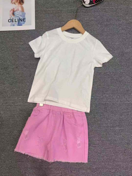 新款女童T恤牛仔短裤薄款韩版洋气百搭中大童破洞毛边女孩热裤T恤套装夏,独...