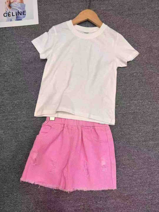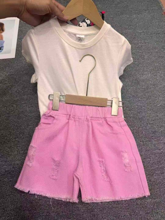 新款女童T恤牛仔短裤薄款韩版洋气百搭中大童破洞毛边女孩热裤T恤套装夏,独...