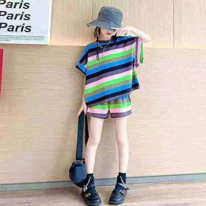 女中大童夏季时尚彩条T恤短裤套装,珠地网眼面料,216套,2-7码,独立包装...