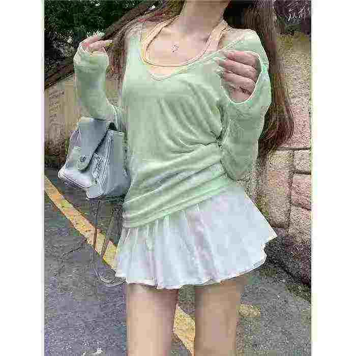 清货7.9V领叠穿防晒长袖T恤气质修身显瘦挂脖吊带背心女夏季纯欲时尚套装,...