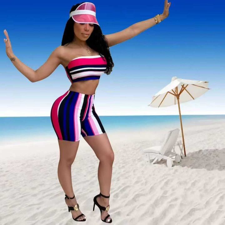 6.8清欧美性感抹胸短裤条纹套装,整款两色,数量210套,码数S-2XL,高弹力...