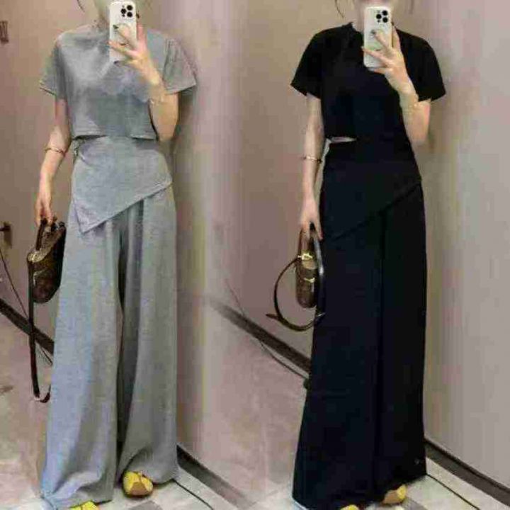 时尚阔腿休闲套装新款设计感洋气减龄显瘦短袖阔腿裤两件套,整款2色,灰色...