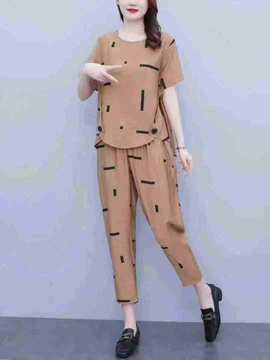 夏季时尚休闲显瘦套装女国风盘扣短袖上衣微喇叭裤两件套,独立包装,货品干...