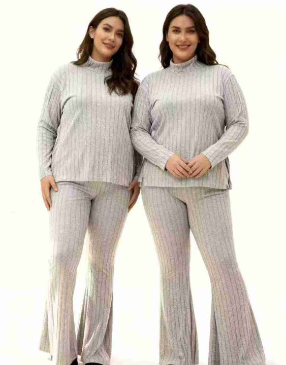 跨境外贸大码女装套装,中高领套装上衣左右两边开叉,微喇叭裤时尚套装,独...