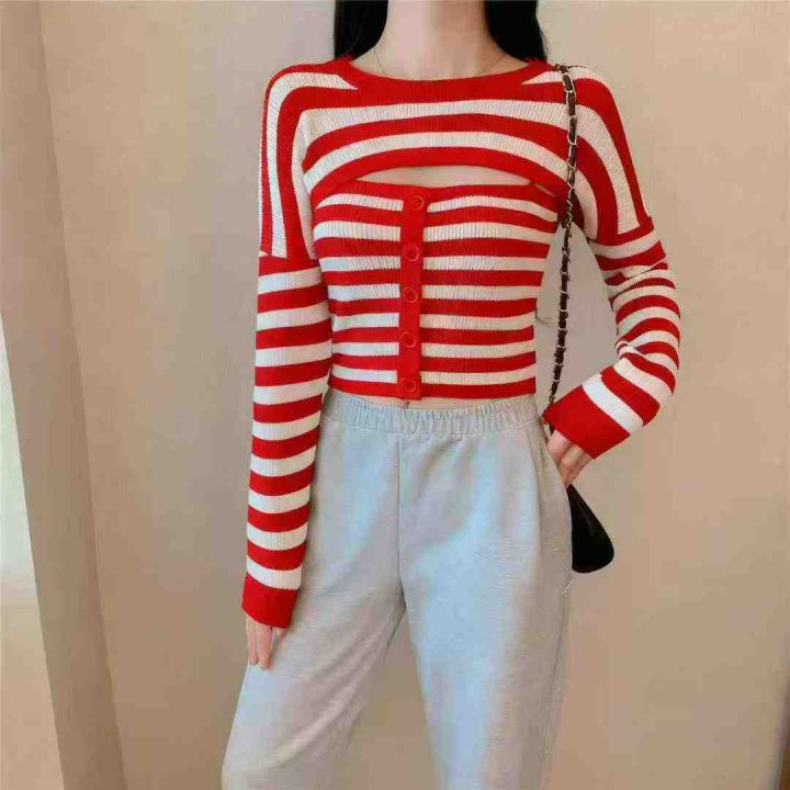 秋季新款撞色条纹软糯吊带背心+针织弹力修身上衣俩件套套装,独立包装,均...