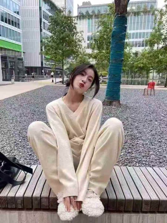 全清22.8,UM休闲慵懒羊毛针织套装女秋冬2025新款V领毛衣阔腿裤时尚...