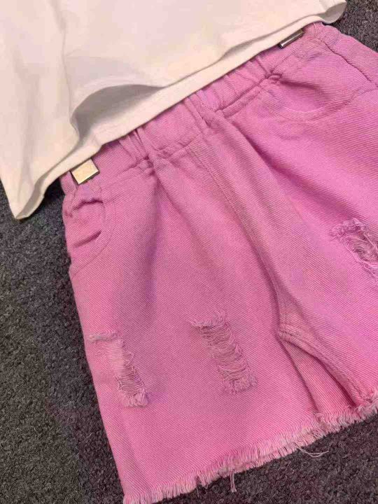 新款女童T恤牛仔短裤薄款韩版洋气百搭中大童破洞毛边女孩热裤T恤套装夏,独...