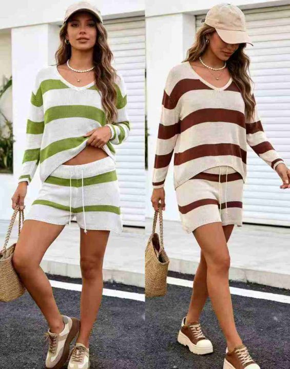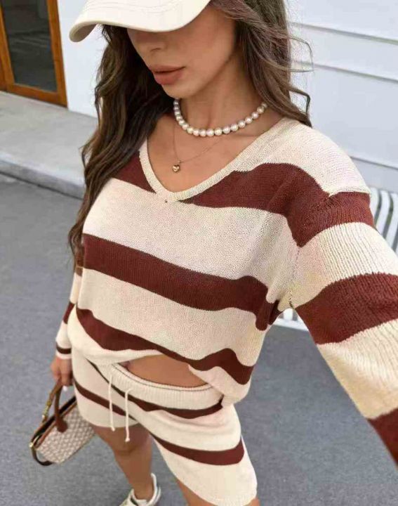 全清价6.898套\'具体点数为准\'长袖薄款时尚百搭条纹针织短裤套装,独立包...