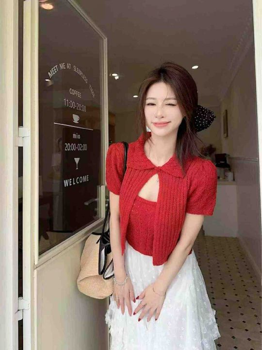 夏季新款时尚简约针织吊带+针织短袖开衫上衣两件套装,独立包装,均码面料...