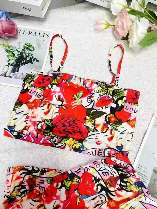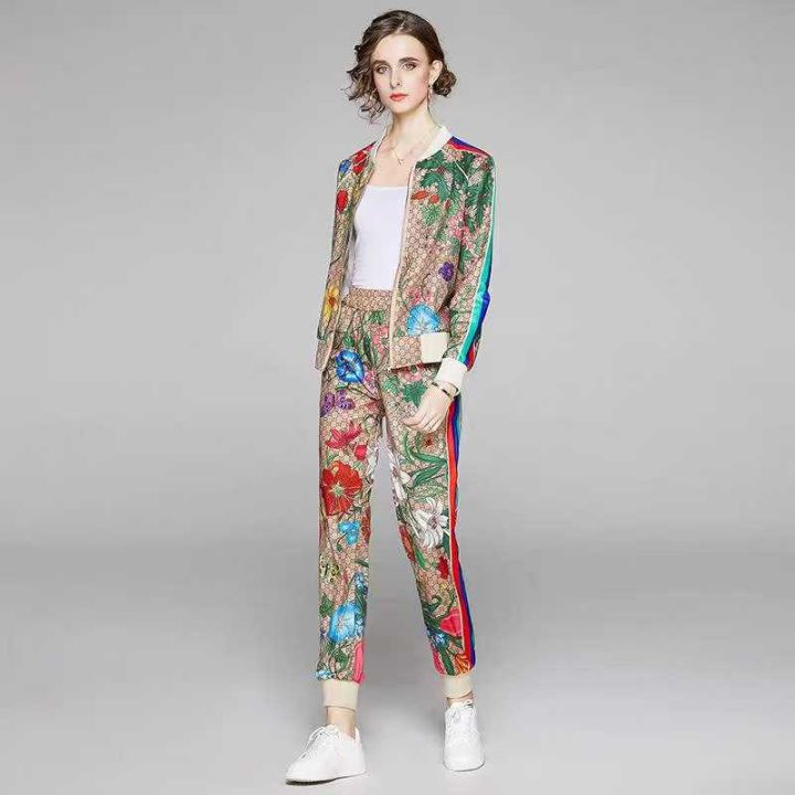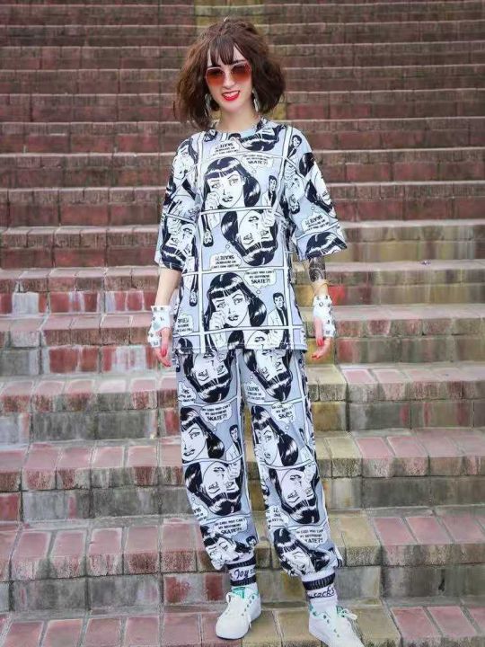 175套圆领印花短T套装。带有裤袋,后领包边,高弹力。码数:S一2XL.拉链式...
