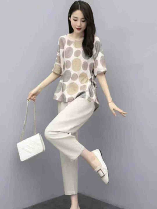 全清价8.9元捡漏64套时尚套装女夏季雪纺印花收腰上衣九分裤宽松洋气两件套...