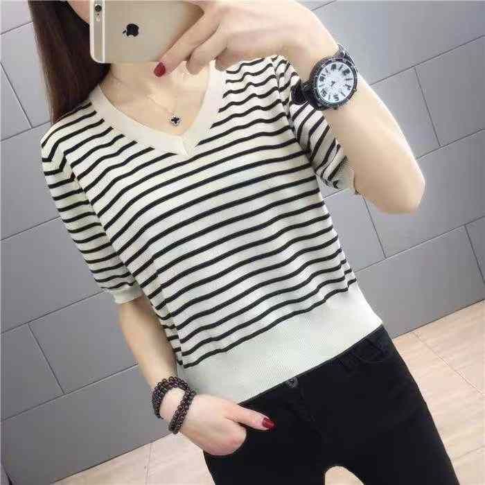 夏季新款撞色条纹V领宽松百搭针织T桖,独立包装,均码面料软糯舒适弹力大,...