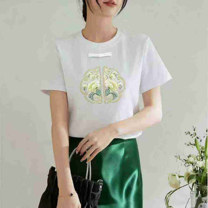1625件国风重工刺绣中式盘扣拉架棉短袖T恤女,以黑色为主 ,尺码:M~2XL,...