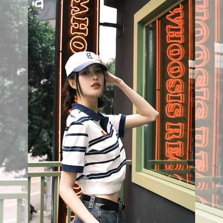 全清价5.9元正肩短袖t恤女短款辣妹小众条纹翻领polo衫,独立包装,后领包边...