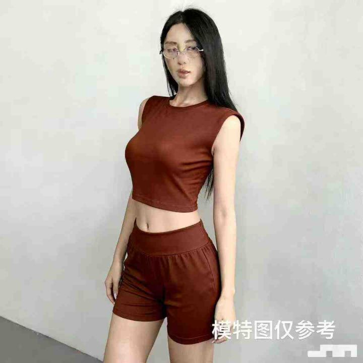 7.5清时尚显瘦肩垫无袖上衣加紧身短裤两件套,整款四色,数量196套,码数S-...
