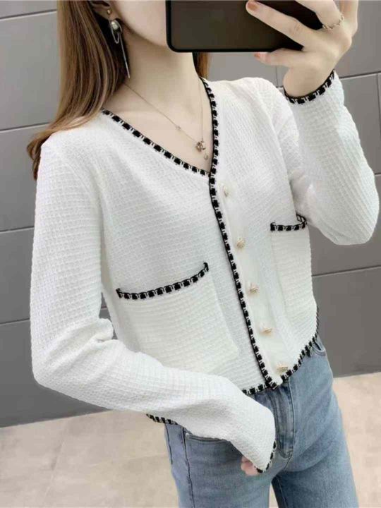秋季新款韩版时尚V领小香风弹力修身显瘦针织长袖毛衣开衫,独立包装货品新...