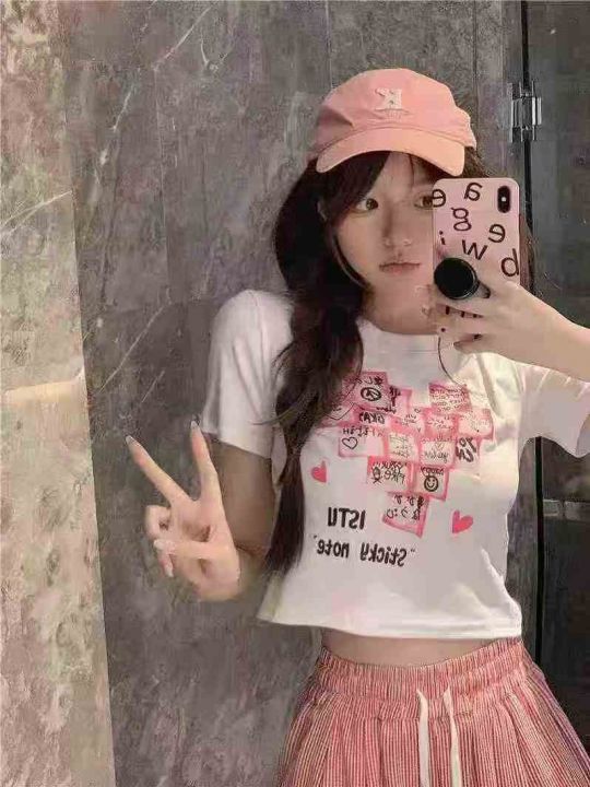 全清价6.9夏季新款爱心印花圆领甜美百搭辣妹短袖短款棉T恤,独立包装,后领...