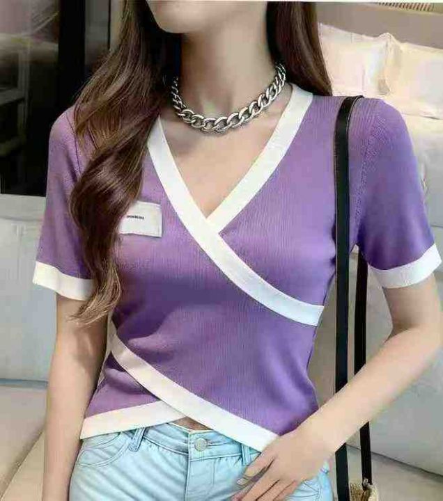夏季新款性感V领不规则交叉辣妹设计感小众洋气针织短袖,独立包装,均码面...