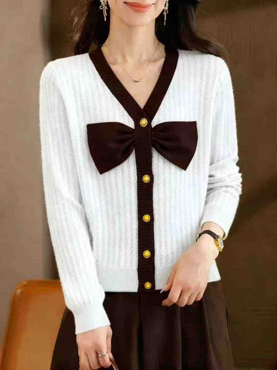 秋季新品优雅气质港风复古chic洋气蝴蝶结名媛小香风长袖针织毛衣,独立包装...