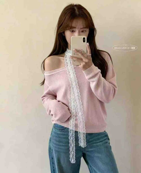 秋季新品十三行温柔甜美蕾丝飘带宽松慵懒风圆领长袖针织衫,独立包装,均码...