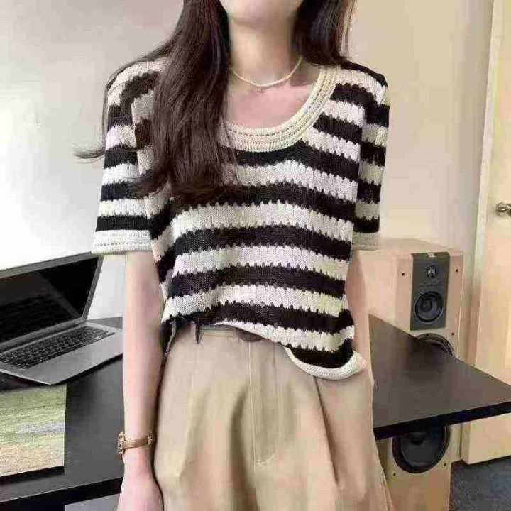 夏季新款冰丝宽松撞色条纹针织短袖,独立包装,均码宽松版,面料柔软舒适有...