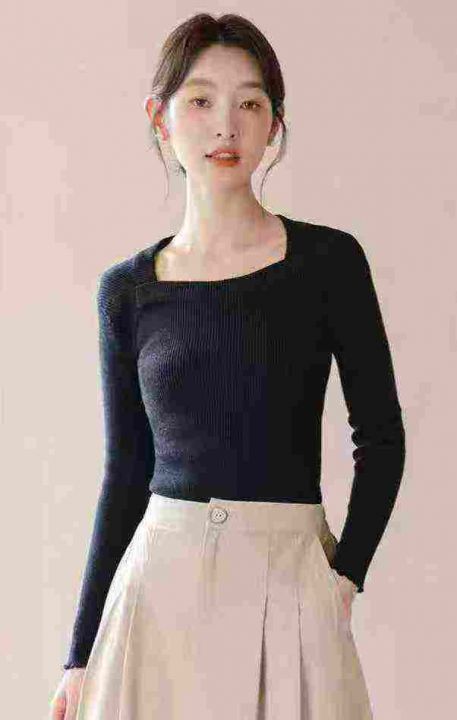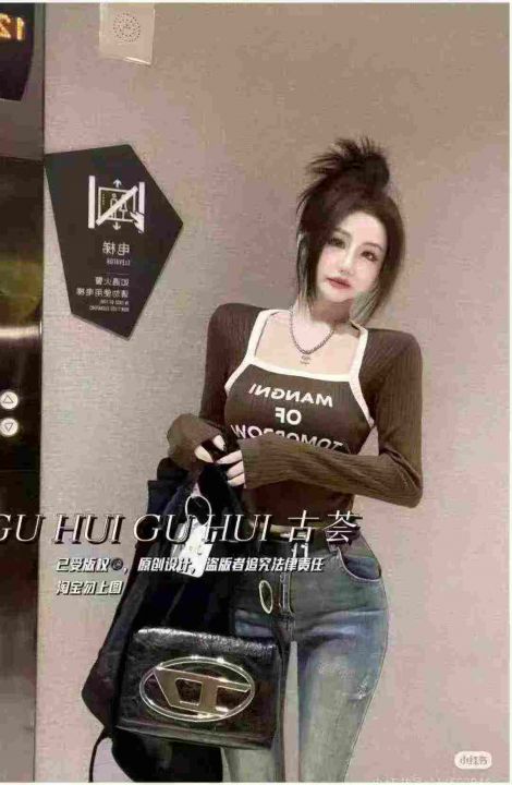 美式时髦拼色假两件方领长袖早秋新款字母修身显瘦针织上衣,品质很好,独立...