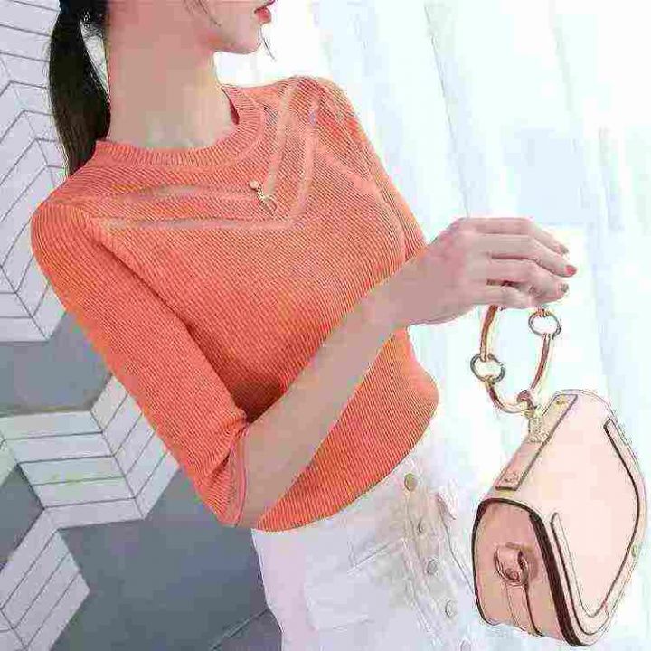 冰丝雪纺拼纱上衣女2025圆领修身显瘦春秋中袖蕾丝镂空百搭上衣,独立包装,...
