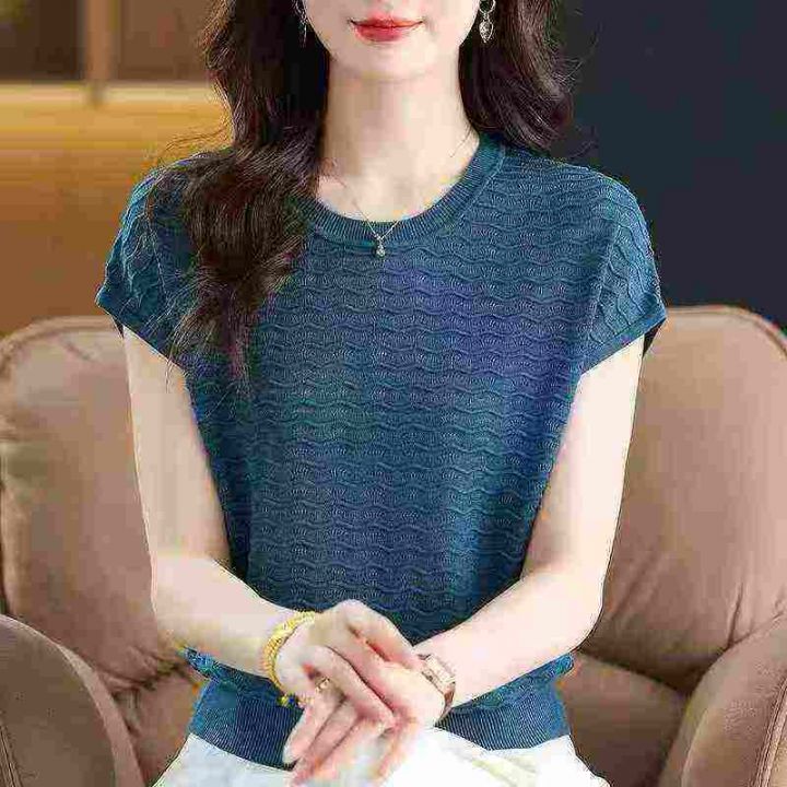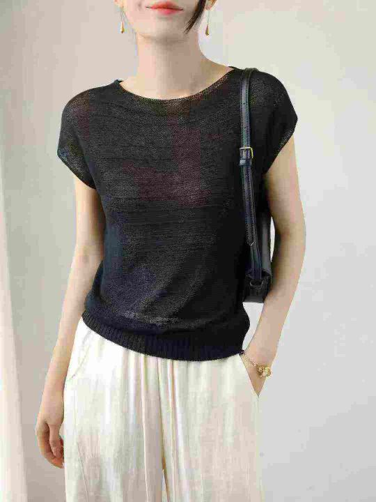 镂空和纸纱坎肩套头针织T恤衫女夏通勤外穿短袖打底轻薄上衣,独立包装,105...