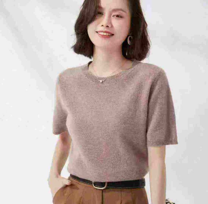 春秋薄款女针织短袖宽松恤内搭打底衫秋季短款上衣女纯色圆领,独立包装,10...