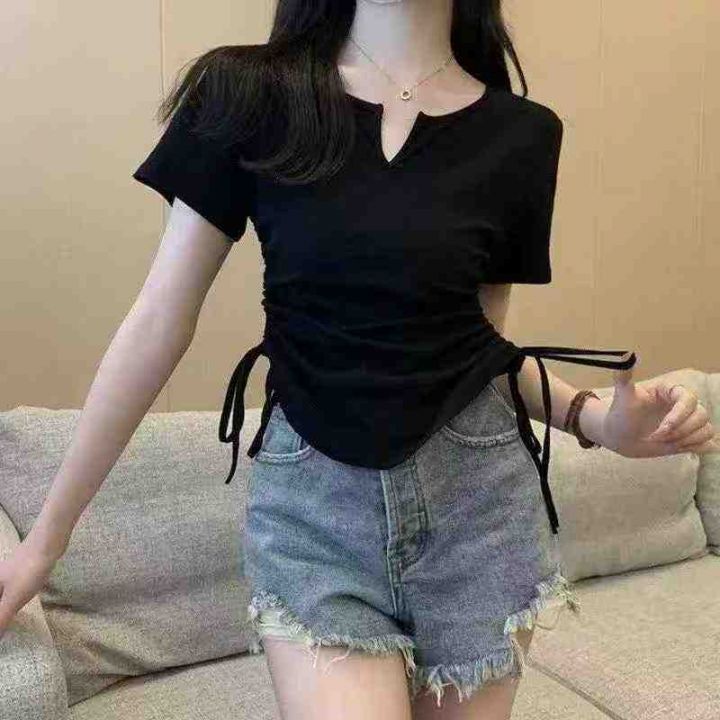 全清价4.9元716件小V领纯色爆款抽绳正肩短袖t恤设计感小众短款辣妹上衣,独...