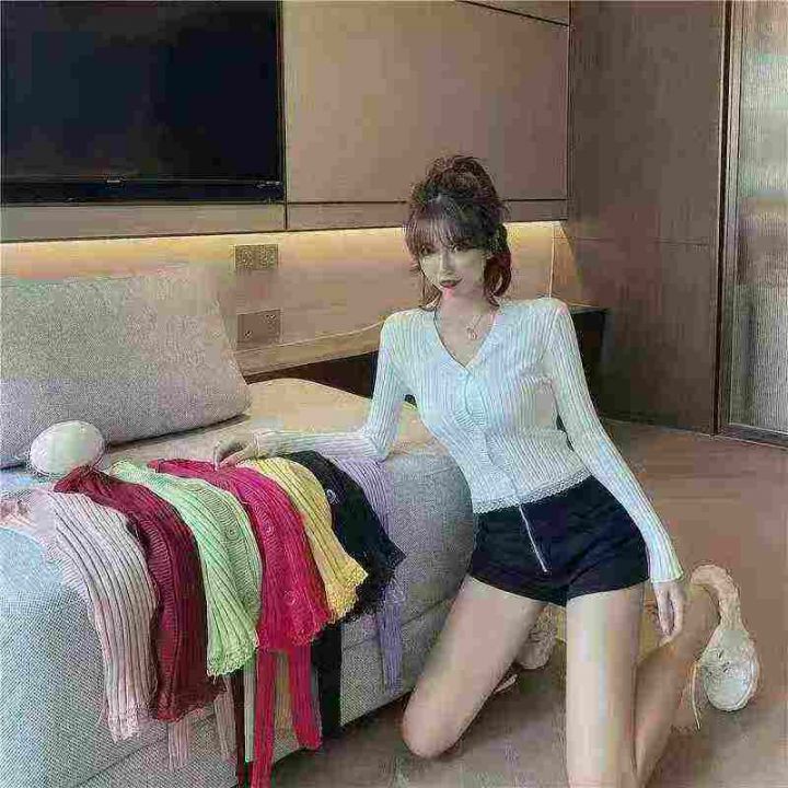 韩版2025chic长袖针织开衫女装外套毛衣春秋新款修身蕾丝边开衫,独立包装,...