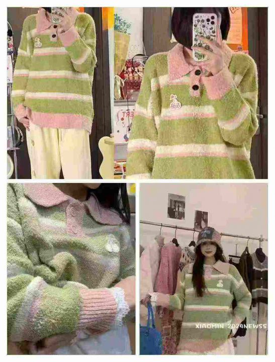 韩版软糯条纹polo领毛衣女甜美慵懒风撞色宽松显瘦百搭套头针织衫,独立包装...