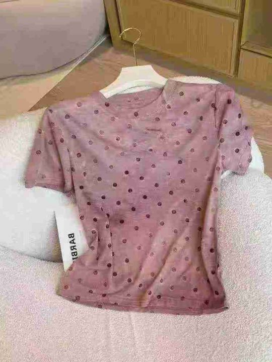 重工晕染波点圆领短袖T恤女夏季设计感显瘦遮肉气质上衣,整款2色,紫色为主...