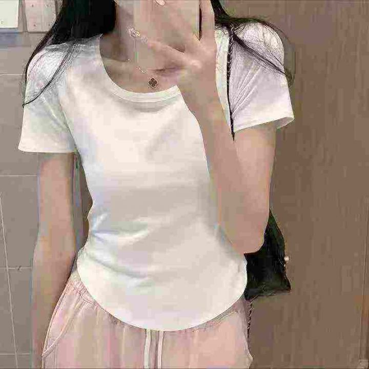 新款不规则短袖复古气质圆领修身弧形下摆螺纹T恤女,整款4色,有后领包边,...