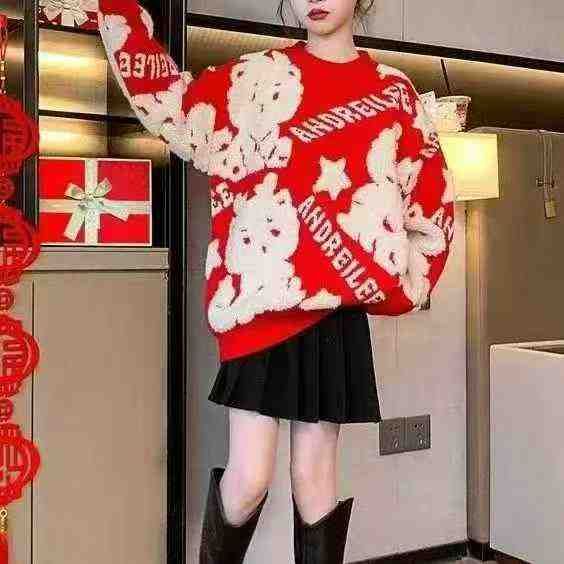 秋冬新款男女童中大童童装复古本命年红色提花包芯纱圆领套头毛衣,独立包装...